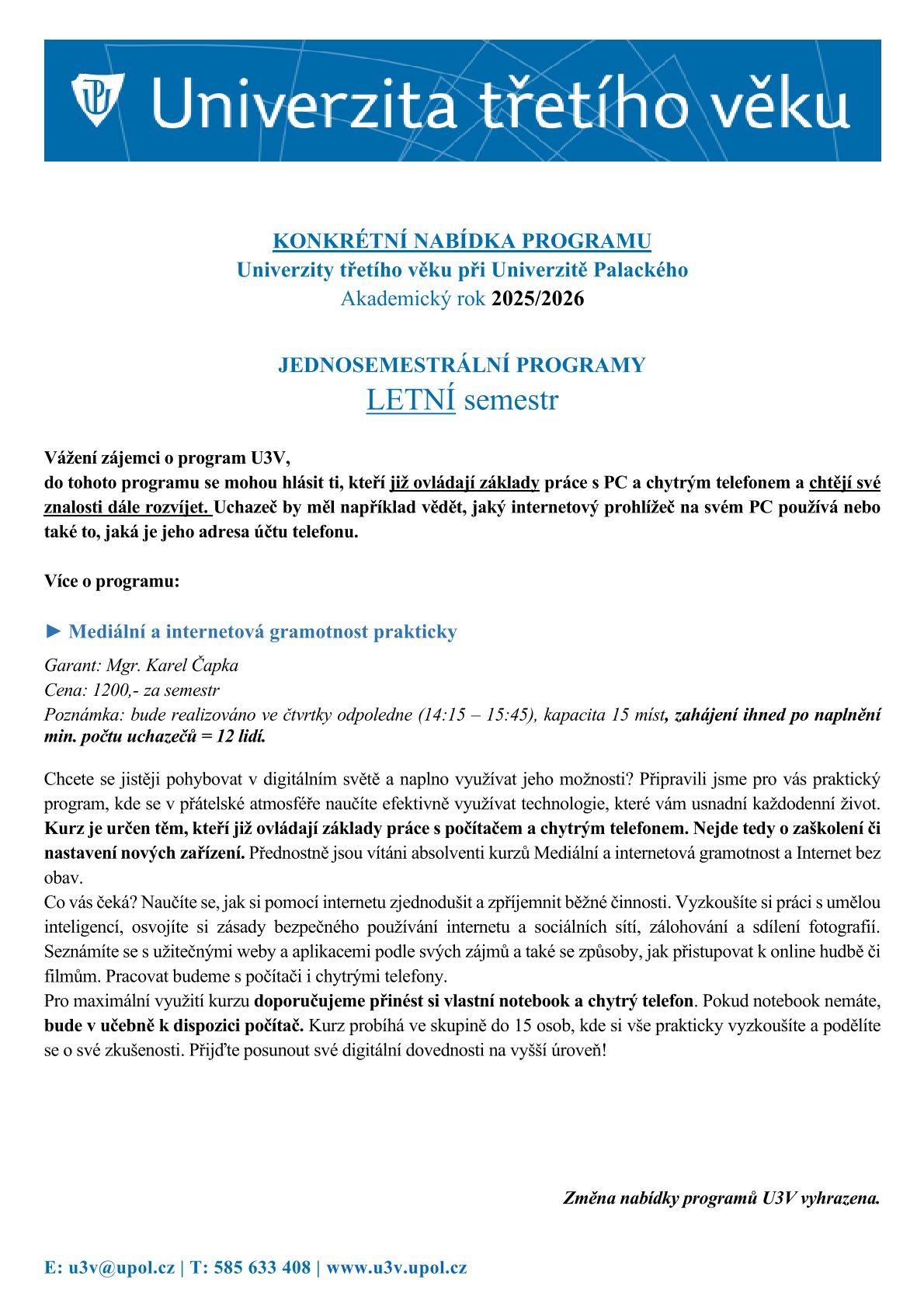 téměř všechny programy U3V již zahájily výuku v letním semestru. Nabídka programů U3V pro akademický rok 2026/2027 zde bude zveřejněna začátkem května 2026. Naši aktivní účastníci ji dostanou do svých emailů.