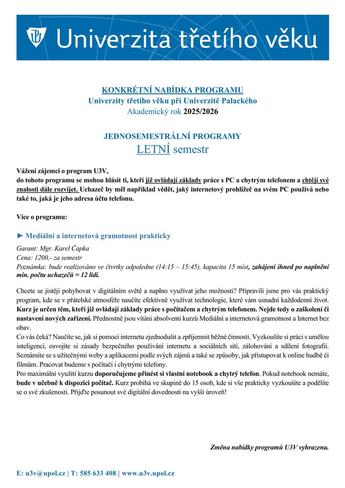 V případě, že byste rádi posunuli své digitální schopnosti na vyšší úroveň, neváhejte se do tohoto programu přihlásit. Jakmile program naplníme, otevře se, tzn. že výuka může začít již koncem března, ale i během dubna nebo května, když už mnohým z vás některé programy U3V končí a otevřel by se vám prostor pro tento „pozdní“ program. ZDE najdete přihlášku, kde v případě zájmu program zaznačte a vyplněnou přihlášku pošlete na u3v@upol.cz