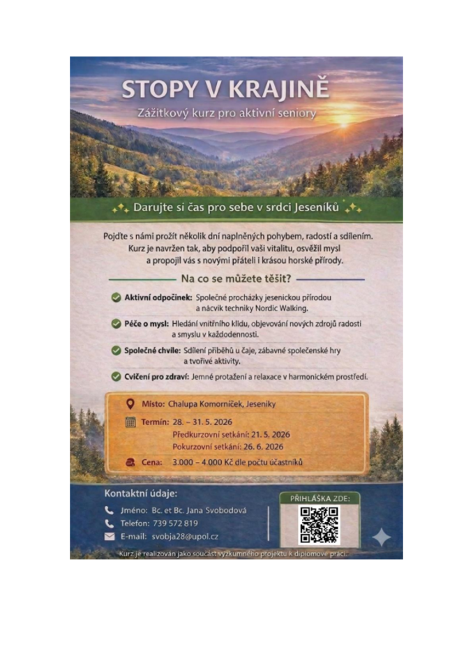 Pokud Vás nabídka oslovila, své místo si můžete rezervovat prostřednictvím přihlašovacího formuláře: https://forms.gle/Jd4jfEvAYV9JbsVm7 nebo QR kód v letáčku. V případě dotazů se na mě neváhejte obrátit.