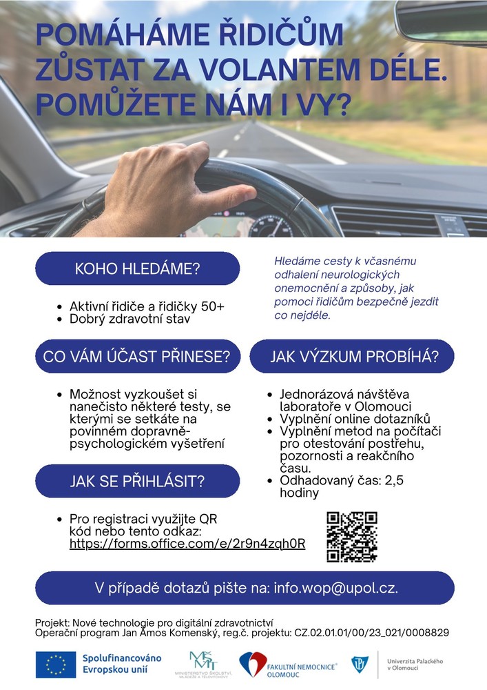 Výzkumný tým na Katedře psychologie Filozofické fakulty Univerzity Palackého v Olomouci se zabývá vztahem mezi neurodegenerativními onemocněními a schopností řízení motorových vozidel.