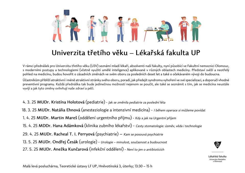 ještě celý únor se můžete hlásit do programu, který nabízí Lékařská fakulta UP. Poutavé přednášky z různých oblastí medicíny představí moderní postupy a technologie, vývoj do budoucna i neotřelý pohled do světa zdraví a péče.